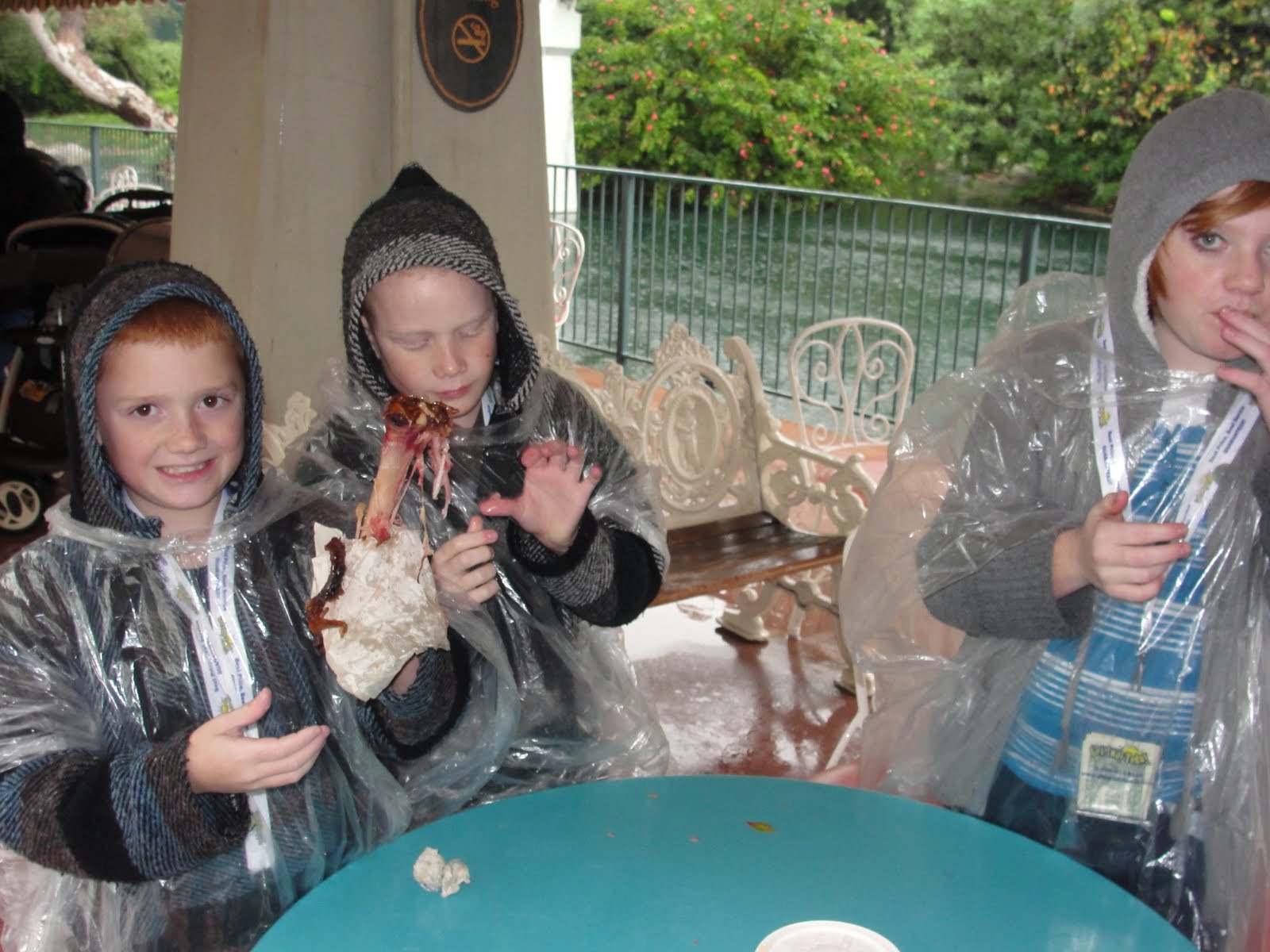 Here we are after using the bathrooms - Byron told us that if the bathrooms were a ride, we would have gone there more than any other ride. The water was just a downpour at this point. Poor Bradley was getting so soaked that I just wrapped him up in this poncho with only his head poking out so he wouldn't get wet.